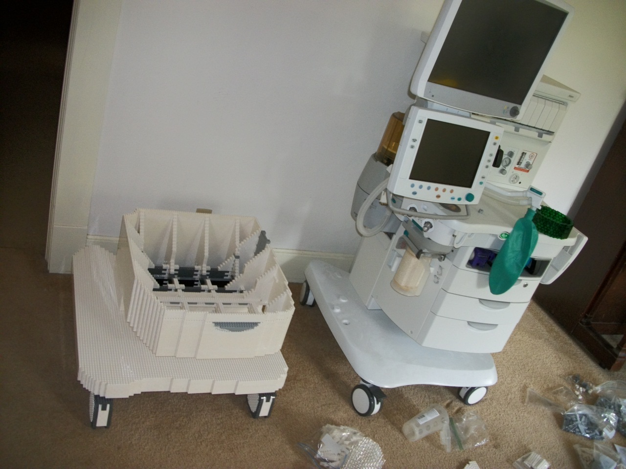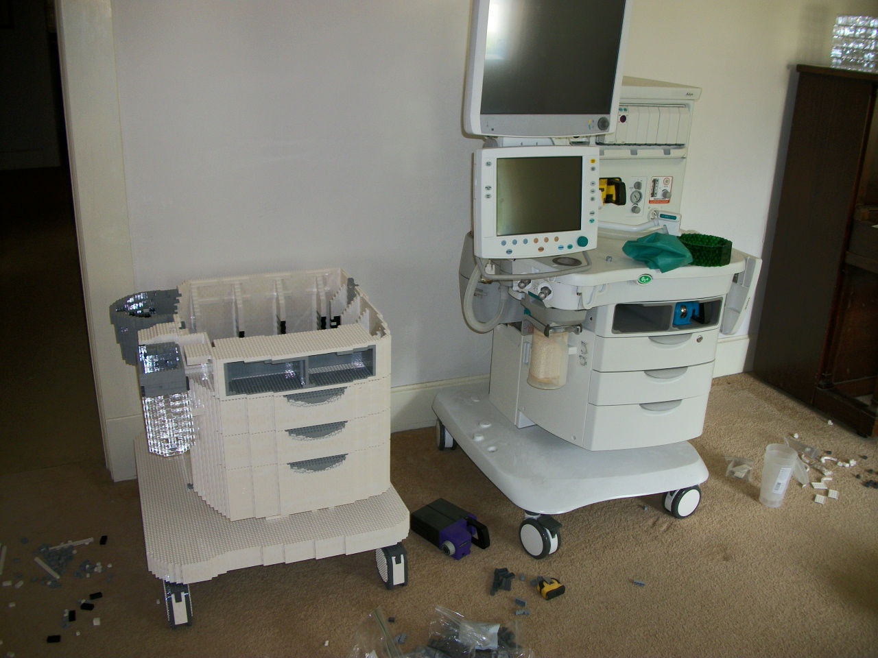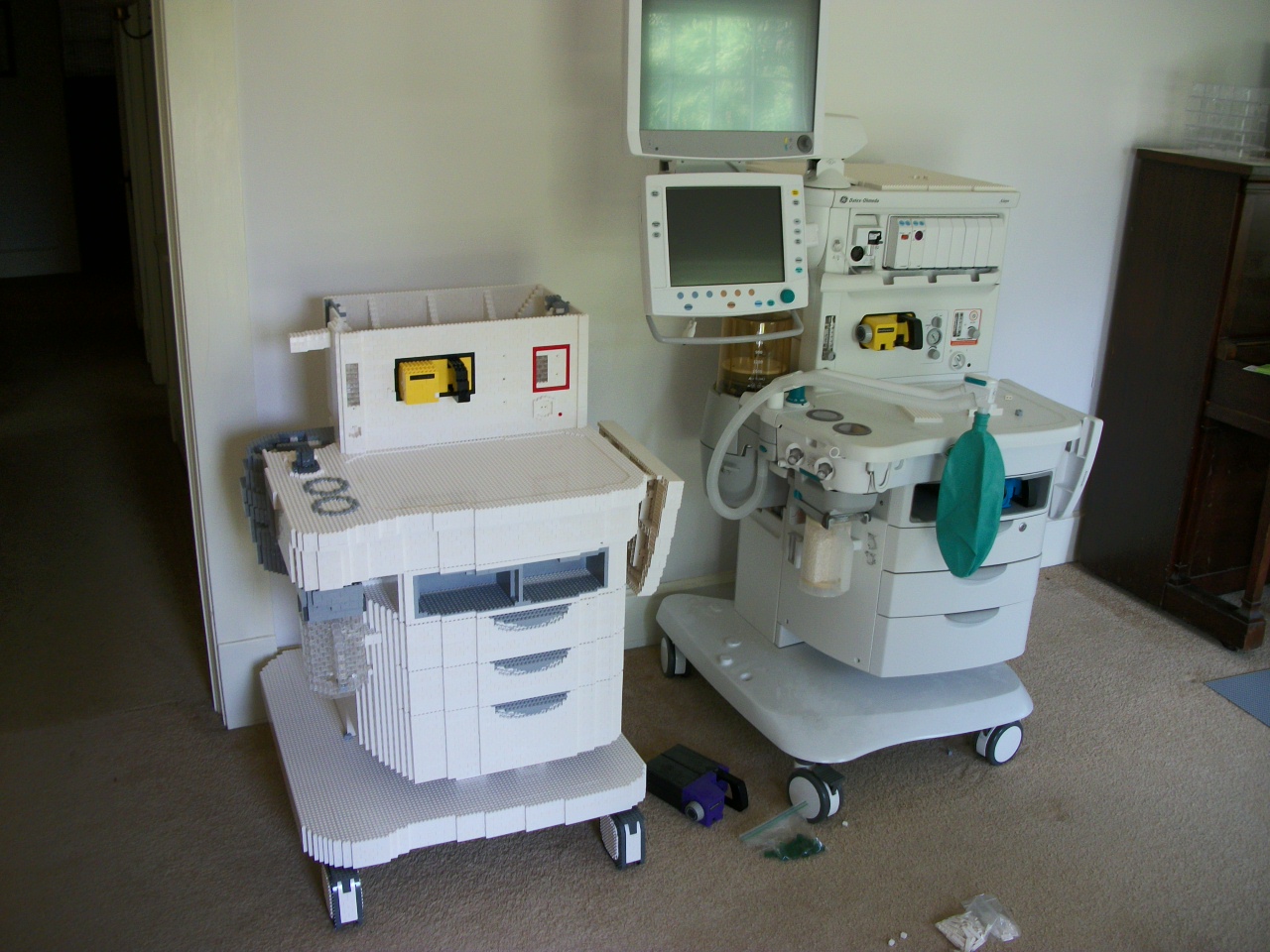 First, I told, them, if they really wanted an accurate clone of this machine, I would need more than a few promotional pictures. I would need an actual anesthesia machine at my studio (that is, my house). Much to my surprise, they said, "okay, what's your address?" A few weeks later I had a legitimate anesthesia machine sitting in my living room (see right, it was one that was being sent away for refurbishing -- now detoured to sit at my place for the summer). We got insurance issues settled, and I made sure they wouldn't mind of my cat decided to climb around on this thing.