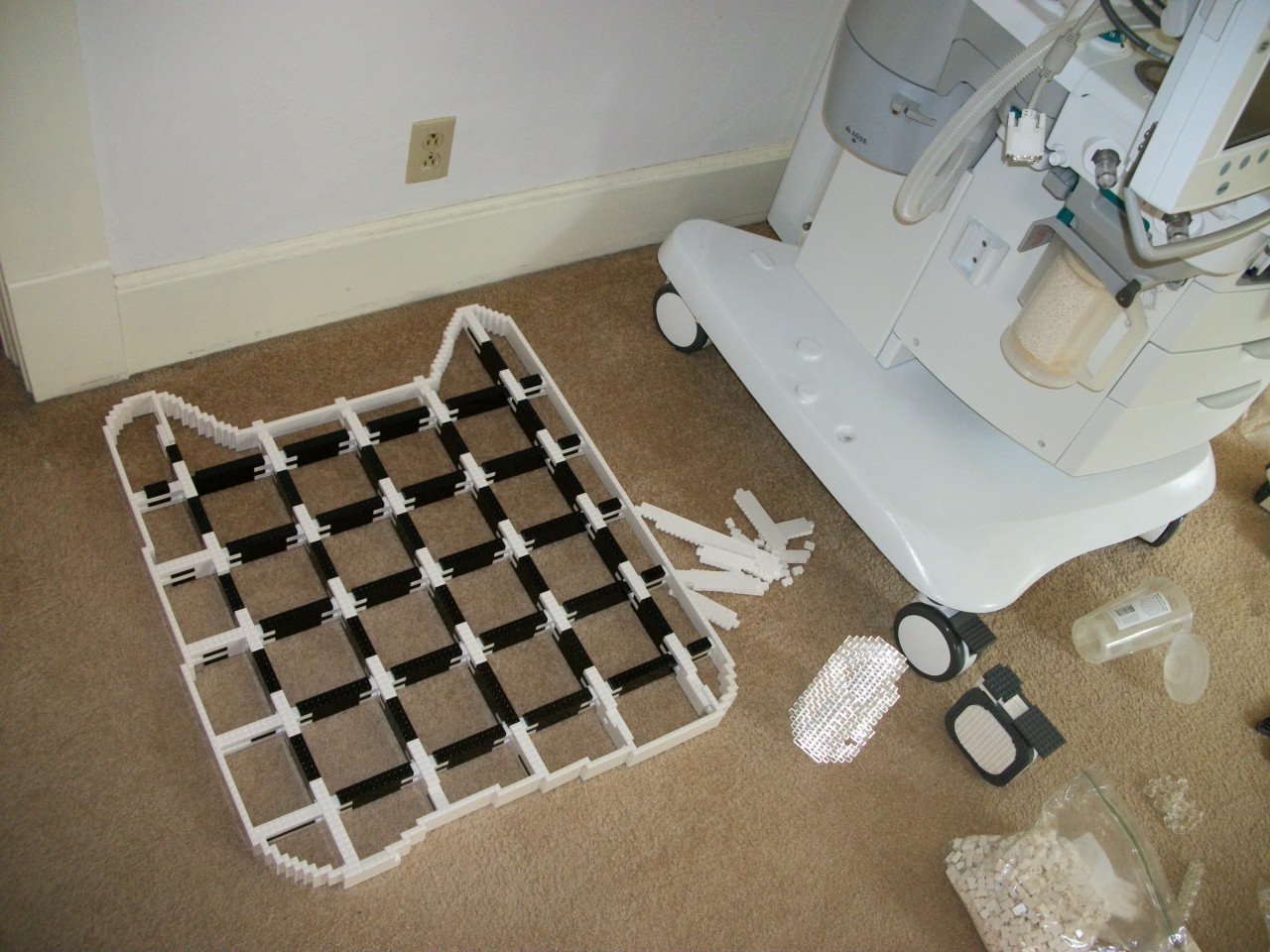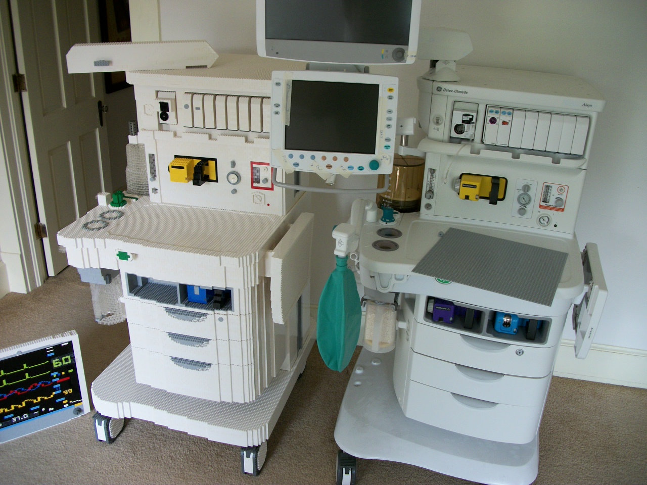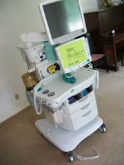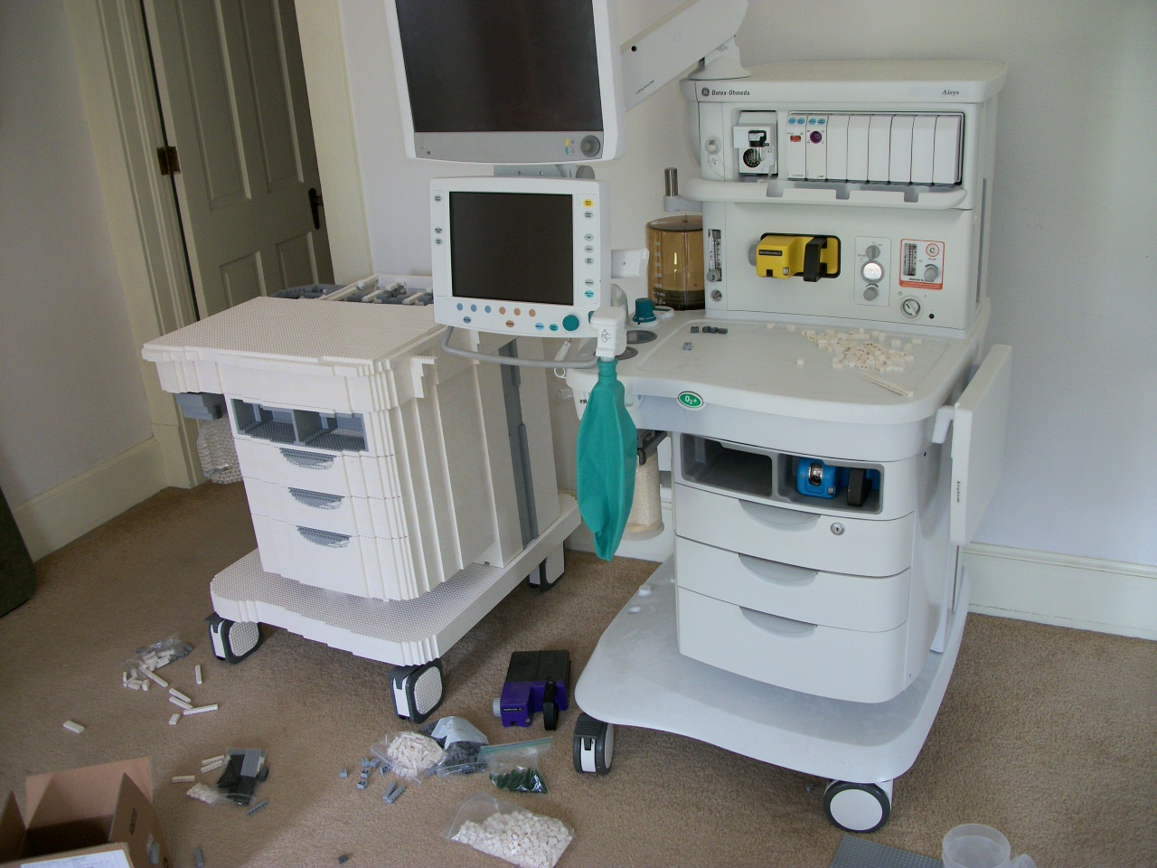 First, I told, them, if they really wanted an accurate clone of this machine, I would need more than a few promotional pictures. I would need an actual anesthesia machine at my studio (that is, my house). Much to my surprise, they said, "okay, what's your address?" A few weeks later I had a legitimate anesthesia machine sitting in my living room (see right, it was one that was being sent away for refurbishing -- now detoured to sit at my place for the summer). We got insurance issues settled, and I made sure they wouldn't mind of my cat decided to climb around on this thing.