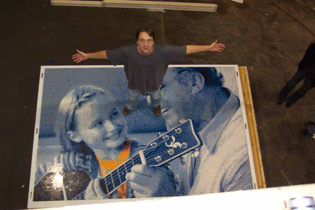 A large mosaic which tied into the theme and slogan for one of the products was agreed upon (the mosaic was a 7' x 10' rendition of an advertisement of a grandfather teaching a granddaughter how to play guitar, it used about 50,000 pieces, including several thousand each of orange, light blue, and gray 1x1s).