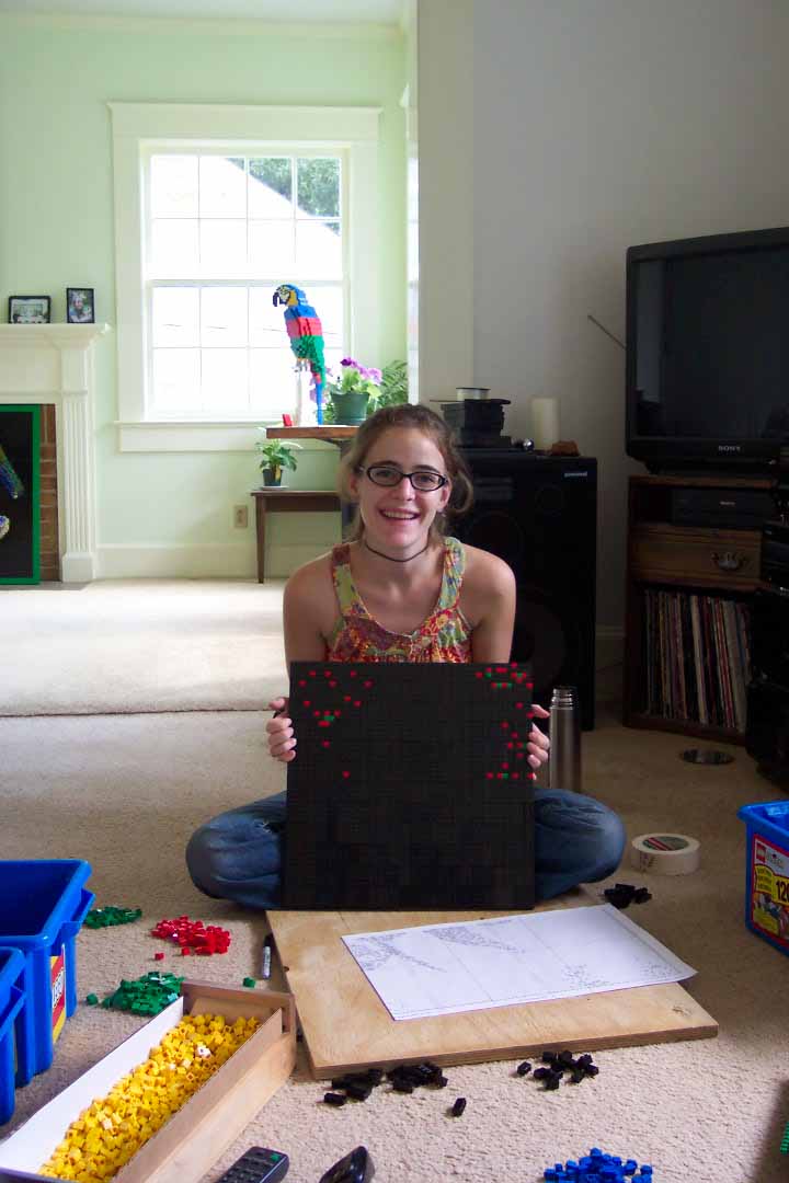 The project was going to require some gluing (the back layer of the mosaic), so we worked out a schedule whereby I would glue ten rows of bricks on the back layer of the mosaic, and then Lauren would follow the printed instructions and actually construct the image from grayscale bricks and plates.