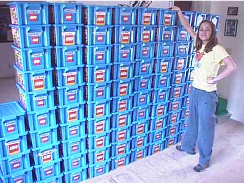 Dorothy stands next to over 90 Blue Tubs. They're each packed full of a particular color and size. |