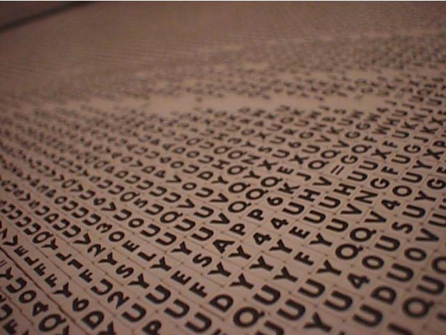 The ASCII Generator program did not care what my supply actually was, so it just used as many of each letter as it deemed necessary. As a result, the output (which was 140 letters wide and 240 letters high) did not come close to matching the letter supply I actually had.
