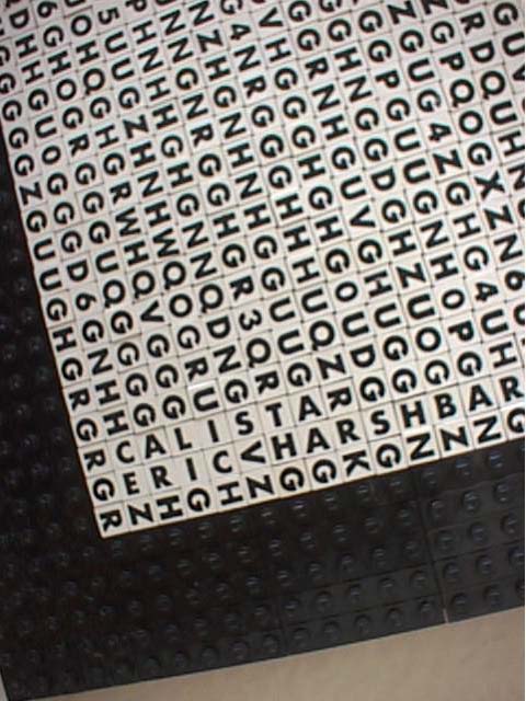 This, of course, means that I have about 30,000 or so letter tiles remaining. Enough for another mosaic! Heh... not one for myself, but I'd could always do one on commission, by request. Such a commssion would not be cheap of course (for a similarly sized mosaic -- 30 inches by 50 inches -- you could expect a price tag of many, many thousands of dollars).
