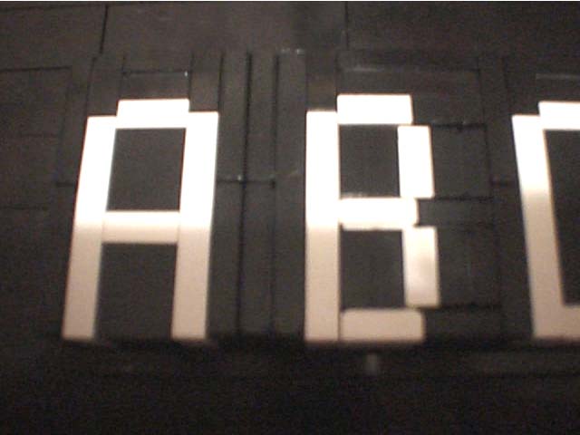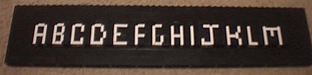The cells in that image are rectangles of side proportion 2:5 (that of the edge of a LEGO plate element). I'll leave it to the reader to figure which pieces must be smooth tiles, and which pieces can be consolidated into bricks. I have used white and black pieces to build the first half of the alphabet above (A-M). One must first build a border of stacked bricks and then slide the letters into the encasement. A closer view of the 'A' and 'B' is available.