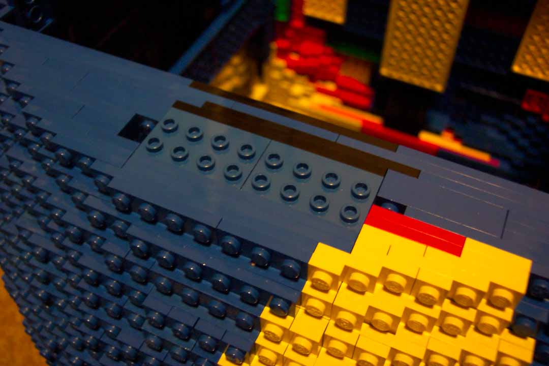 This process of building with both tan and blue was MADDENING. Building one of the sections in all one color was challenging enough; but having to remember when to start using some tan bricks, and getting all of the pieces to interlock while not accidently exposing a wrong color somewhere was mind boggling.