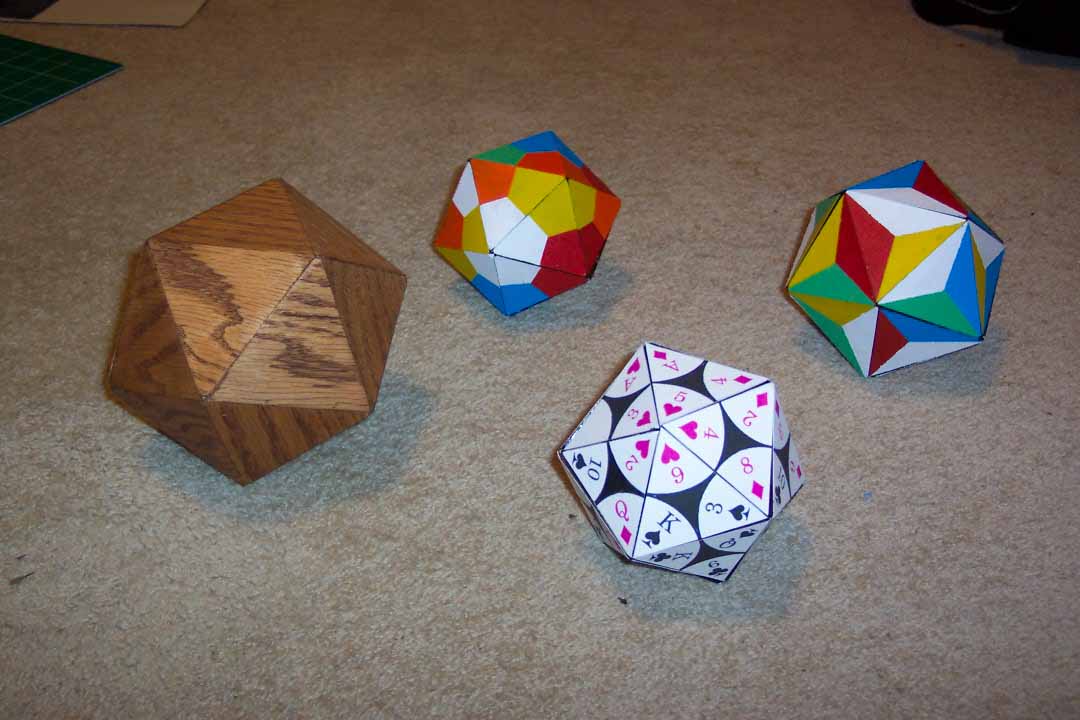 I've been in a "20-sided mood" of late, constructing other icosahedrons mainly out of wood. In addition to just really liking the shape, I use the polyhedron to create various puzzles and games (some folks might recall that I had such a wooden puzzle at Brickfest this year). Since I was about 10 years old I knew how to cut and fold all the Platonic Solids from paper, but only recently have I started manufacturing some out of wood (finally paying attention to things like dihedral angles and the like).