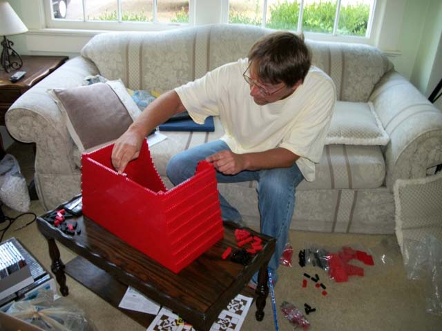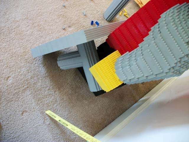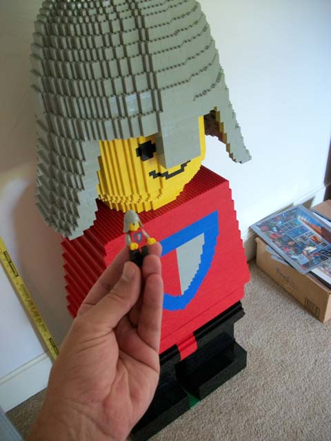 The building was not strenuous at all. The model was fairly symmetric. Only his arms required any free-style sculpture. I had a ruler that measured in increments of 1/64", and with horizontal and vertical conversion rates stored in my calculator's memory, it was not to hard to scale the mini-fig into a mega-fig.