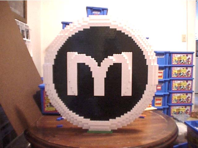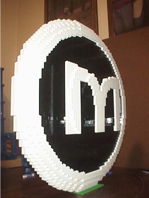 I also constructed a 'Circle-M' logo which had a diameter of 60 studs (and thus was a nice circle at 50 bricks tall). I used black for the interior of the circle so that the M could appear suspended within the outer ring (again, purple was not an option, and black helped hide any support bricks that stuck out from the center to hold the M in place).