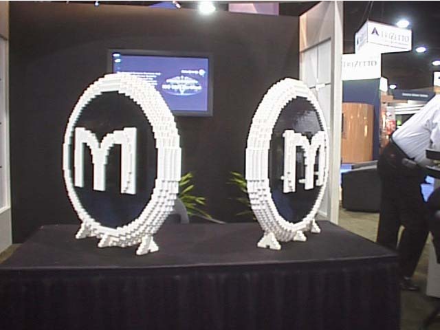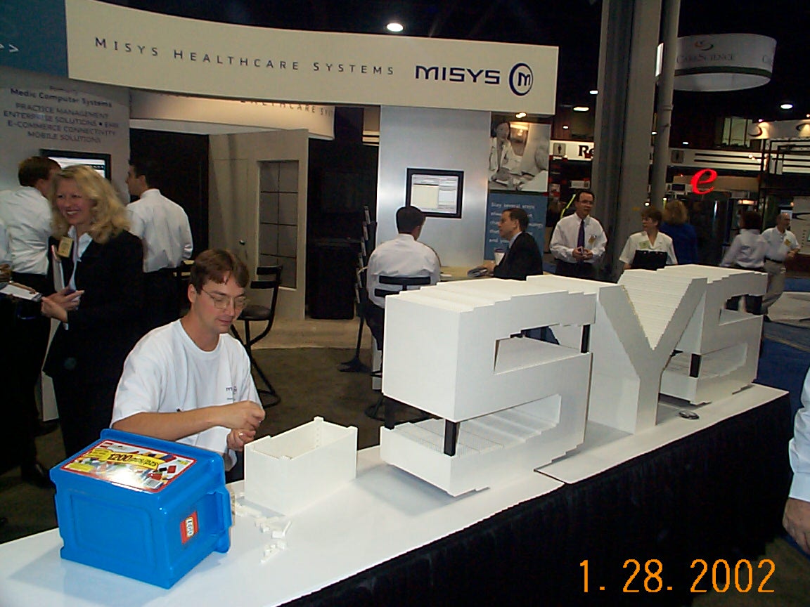 The company MISYS had requested that I construct their logo out of LEGO blocks. I was to be present at the HIMSS tradeshow (I think those initials are for 'Health Information Managment Systems Society', but don't hold me to that). During the four day event they wanted me to build the word 'MISYS' and their 'Circle-M' emblem.
