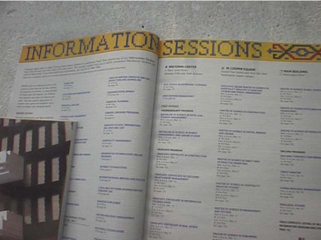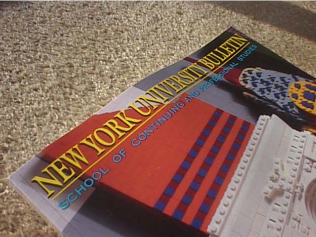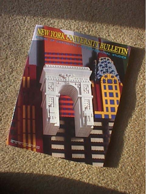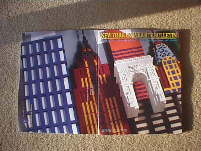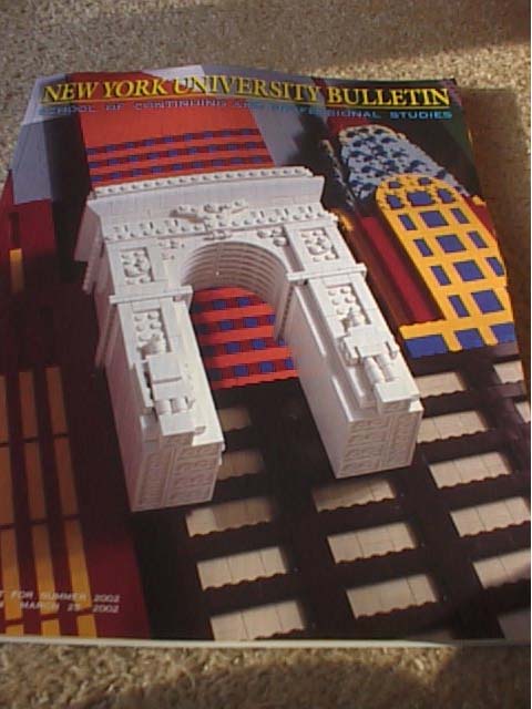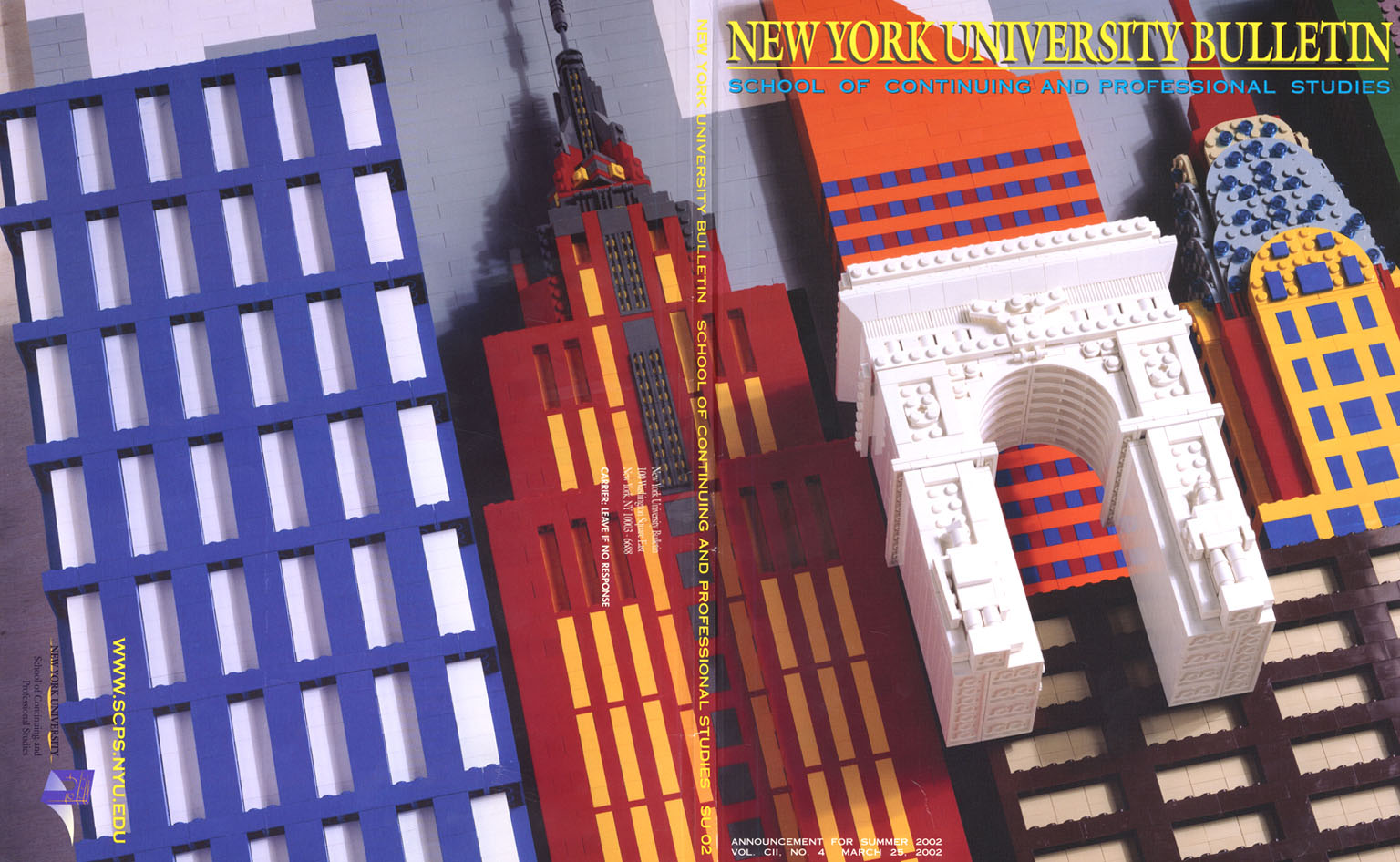 NYU In the Spring of 2001 fellow LEGO sculptor Henry Lim and I were asked to create the cover art for a bulletin printed by the New York University School of Continuing And Professional Studies. This is a bulletin that has been put out every term for quite some time, and each for issue the school commissions an artist (or artists) to design art that is to be photographed and printed on the front and back covers of the 10.5"x13" glossy color booklet.