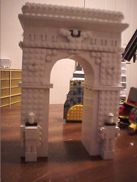 And lie upon the buildings must, because it was desired to have the arch photographed from a VERY LOW ANGLE (the camera was to shoot upwards from well below the lower left corner -- so low that the *bottoms* of the plates of the arch would easily be seen).