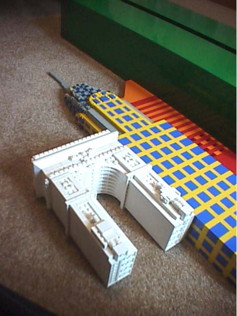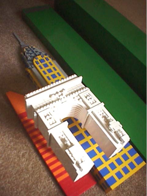 After I had finished the arch, the buildings behind were to be constructed. Henry and I decided to include colorful models of: The Chrysler Building, The Citicorp Building, and The Empire State Building. Henry built the last two of those while I tackled the Chrysler building along with a few 'generic buildings' which were to add further depth and color to the final image.