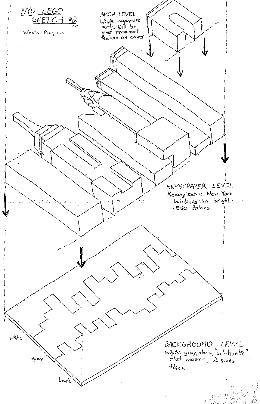 Generally, the Washington Square Arch acts as a focal point of all the bulletin covers (as the Arch and its Park mark the entrance to NYU in New York City). With that in mind, a concept of the artwork was tossed about for a month or so, and in early Summer I began to construct the Arch out of white LEGO bricks.