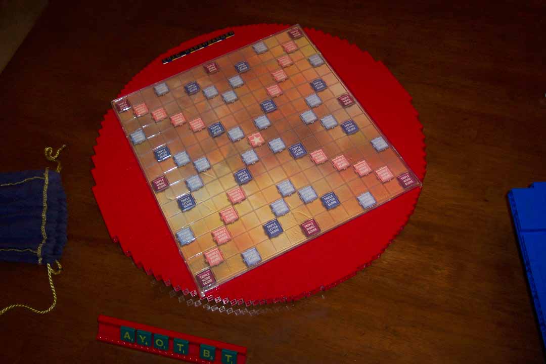 Scrabble boards are a very serious thing at tournaments. You can buy "deluxe" Scrabble sets at the toy store... they spin about, but they have a major shortcoming: the rotating board is rectangular. In the heat of competitive play, most players unconsciously move their racks of seven letter tiles toward the board. Then, when their turn is over, the opponent spins the board. If the board is rectangular, the corners form a longer radius in the rotation, and wham!, the racks of tiles are often hit by the board as it spins about.