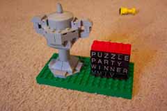 The gray trophy uses LEGO letter tiles which are a fairly recent product. Each package of tiles contains two copies of each letter (plus extra vowels and the letter "N"). The message I spelled out, "PUZZLE PARTY WINNER MMIV", was so constrained: at most two of each letter is used. No numbers are yet available, so I went with Roman numeral year designation.