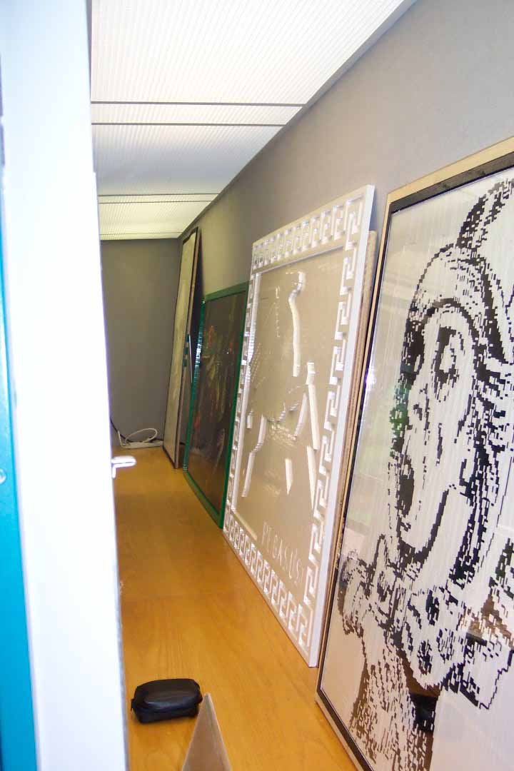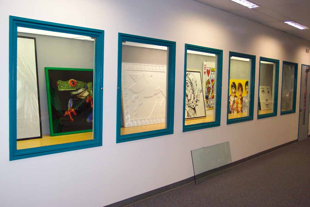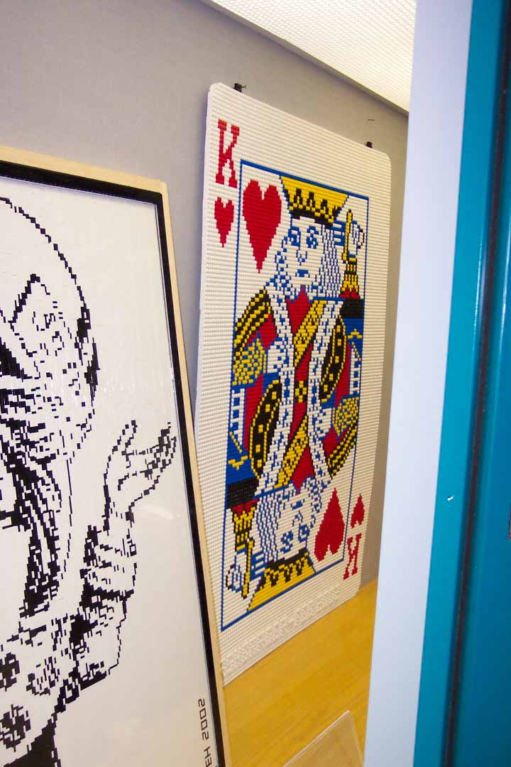 The installation of the mosaics went much more smoothly than either one of us dared to hope. There were not mishaps, nothing was dropped, and since the display space was very large, behind secure glass cabinet doors, and furnished with a heavy cabinet base, it was really just a matter of setting the works into place (only the King of Hearts mosaic was actually hung on the wall).