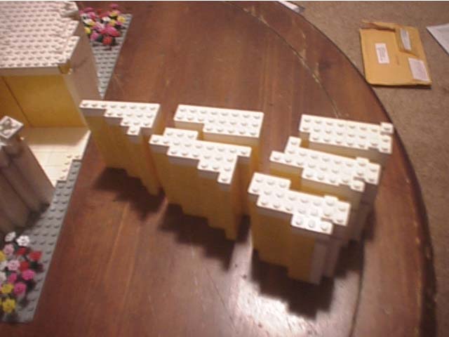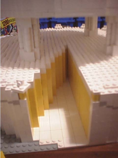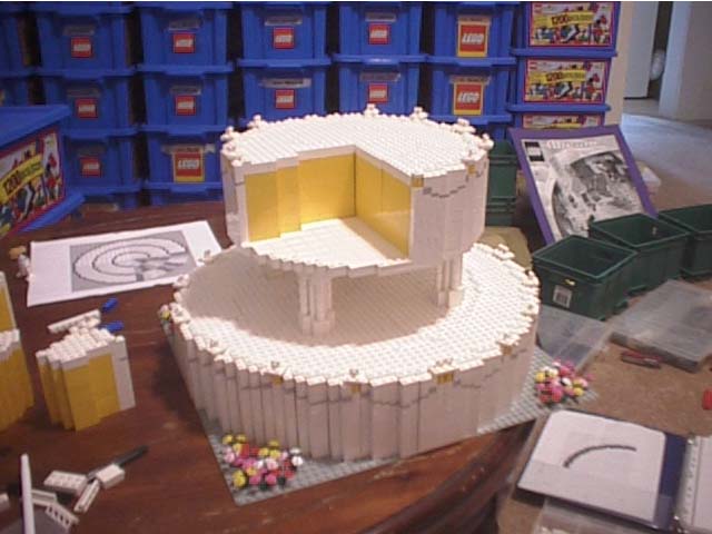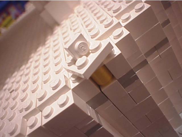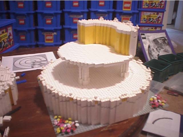 The building of the cake went pretty much according to plan. Man, did it use a bunch of small pieces. In order to use up some of my many lesser sized bricks I tried to use as many 1x2s and such as possible. In the end I think I used about 3,000 yellow 1x2s as well as many other sizes in both yellow and white.