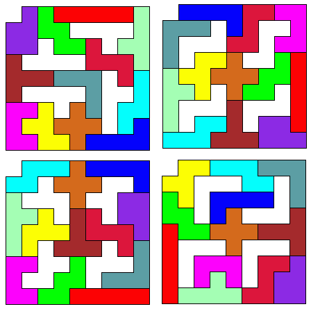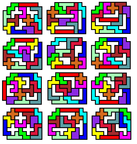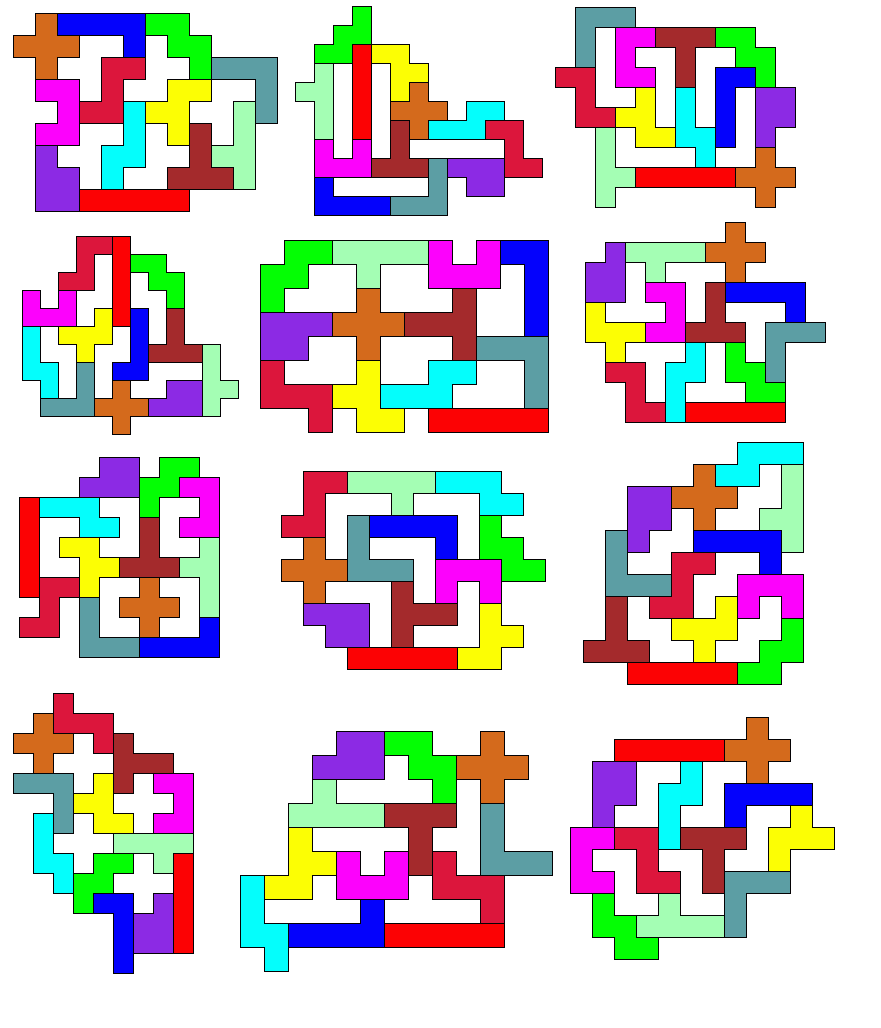 I do not know whether quartets or quintets of other shaped pieces may be enclosed. And I conjecture that no sextet of pieces can be enclosed. - Eric Harshbarger, 2 Jan 2005 Update (14 Jan 2005): Michael Keller and Aad van de Wetering both attacked my triplet question above and within a day of each other sent me emails. The former's included the following kind words: It's too bad there isn't an annual award for best new pentomino problem. Eric Harshbarger would be my nominee for 2005, even though the year has just begun...
