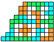 While compiling and inventing designs for the Pentomino Daily Calendar I included twelve configurations which are often thought of as "missing piece" designs. Since each of the 12 pentominoes is made from 5 squares, any design based upon all of them will be composed of 60 squares. One can concoct designs based on a 5x13 rectangle (65 squares) which has a "hole" in its interior. This hole can take the shape of any of the 12 pentominoes. For example, here is a solvable design, a "missing N" configuration: